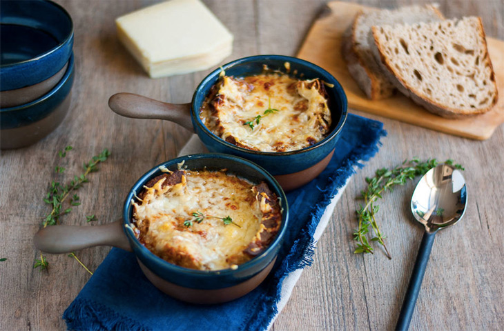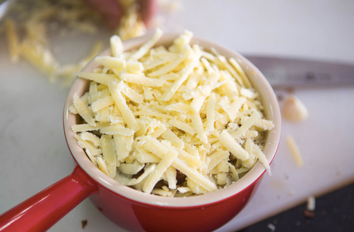 Если придерживаться все той же классики, то свой выбор стоит остановить на сыре Грюйер. В качестве альтернативы можно использовать Эмменталь. В тертом виде или пластинками сыр добавляют в самом конце приготовления, выкладывая поверх гренки. Чтобы сыр образовал ровную курочку, между кусочком хлеба и кромкой посуды необходимо оставить примерно 1,5-2 см. Если жидкости будет слишком мало, сыр просто утонет в супе.