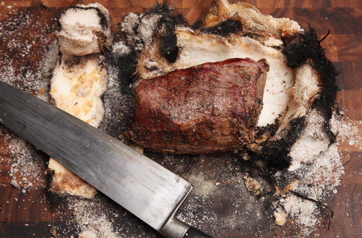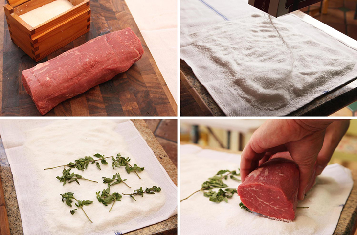 Завернуть кусок мяса в полотенце — простая задача со сложным исполнением. Тут чрезвычайно важно врожденное чувство эстетики и баланса, проявления которого нарабатываются с опытом. Есть небольшая хитрость — чтобы все получилось гораздо проще, смочите полотенце водой перед тем, как засыпать его солью. Для закрепления свертка можно использовать веревки и нити из органических волокон.