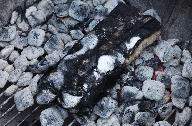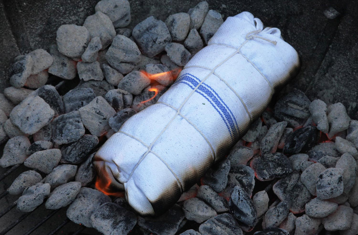 Класть сверток ломо аль трапо можно прямо в на горящие угли. Нет необходимости сбивать пламя, но можно присыпать мясо углями сверху для равномерной прожарки. Такой метод используется в множестве традиционных кухонь мира. Но если толщина углей не позволяет, сверток можно переворачивать с помощью лопатки, не опасаясь раскрыть обертку. Уголь из супермаркета вполне подойдет в качестве топлива, а еще ломо аль трапо можно готовить одновременно с другими продуктами на решетке или шампурах. Узнать о готовности мяса можно с помощью термометра-зонда.