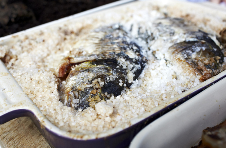 Традиционно, метод соляной корки используют для приготовления рыбы. Впрочем, никто не мешает вам попробовать прием для других продуктов. Готовить рыбу в соли придумали итальянские рыбаки. Они клали в котелок на слой крупной морской соли только что выловленную рыбку, сверху насыпали еще слой соли и вешали котелок над костром. Сегодня подобным образом легко приготовить рыбу в кухонной духовке. Для этого способа лучше всего подходит морская рыба. Толстая кожа не позволит впитаться лишней соли в процессе приготовления, поэтому не стоит бояться ее пересолить. Скорее всего, рыбка получится даже немного недосоленной, поэтому шеф-повара рекомендуют при подаче положить на тарелку кусочек соляного панциря, чтобы можно было довести ее до вкуса уже за столом.