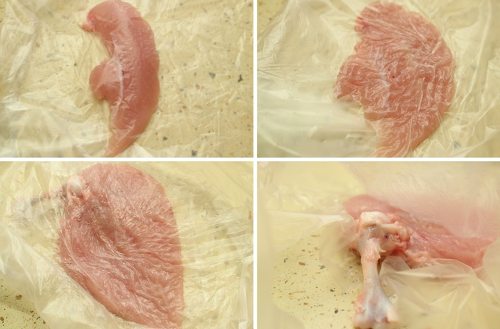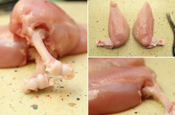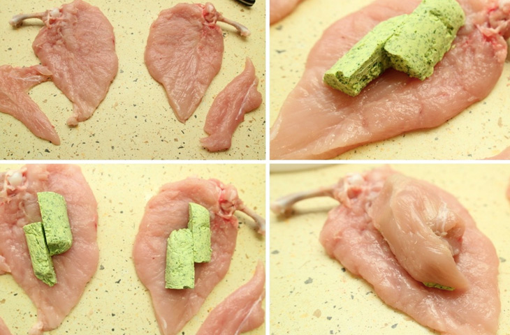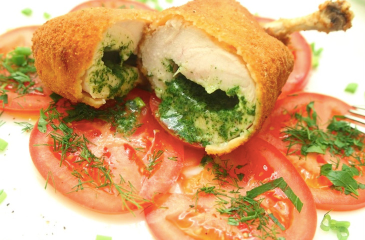 С курицы срезать с двух сторон грудки вместе с крыльями. Удалить нижнюю часть крыла, оставив лишь одну косточку — ее необходимо зачистить. Снять кожу, отделить малое и большое филе. Малое филе раскрыть, слегка отбить оба филе, посолить и поперчить. Застывшее масло выложить на большее филе, накрыть малым и завернуть так, чтобы котлета приобрела первоначальную форму.