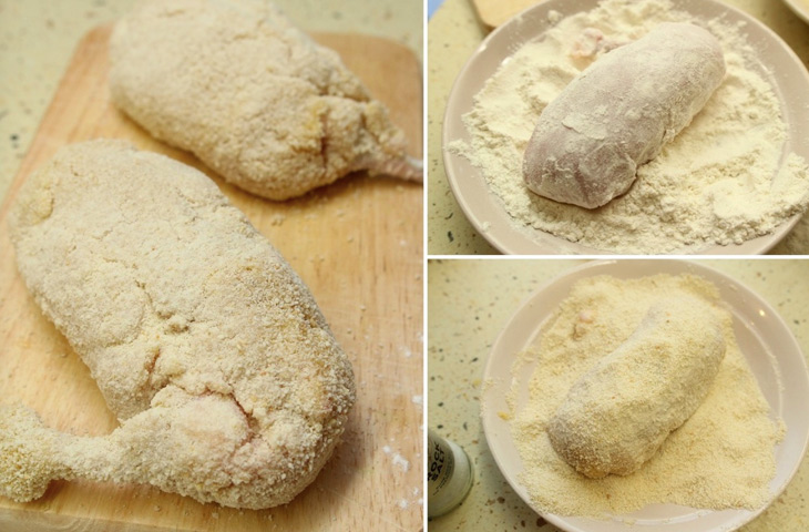 По трем тарелкам разложить панировку: муку, взбитое яйцо и панировочные сухари. Обвалять котлету в муке, стряхнуть излишки, окунуть в яйцо и обвалять в сухарях. Затем еще раз окунуть в яйцо и снова в сухари. Убрать котлеты в холодильник примерно на 20 минут.
