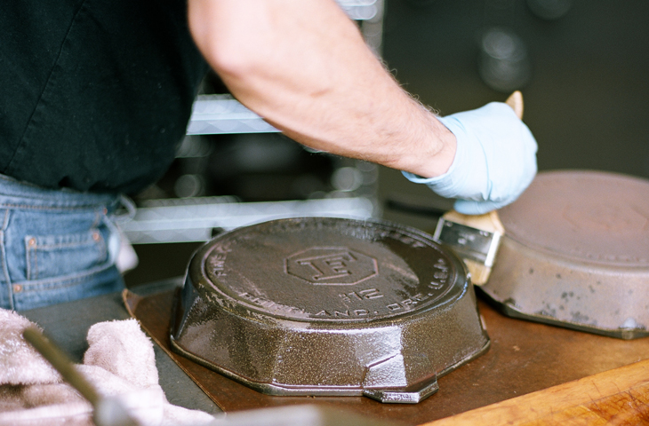 Если на чугунной посуде начали появляться пятна и ржавчина, а к стенкам пригорает еда — посуду следует повторно прокалить. Сковороду или жаровню прокаливают без масла при 100 °C в течение 20-30 минут. Затем посуду остужают, смазывают растительным маслом и снова отправляют в духовку, разогретую уже до 180 °C, и оставляют на 1 час. Прокаленную сковороду вытирают насухо и смазывают тонким слоем масла.
