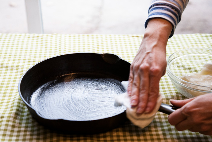 Распределите равномерным слоем (по возможности спреем) растопленный жир или растительное масло по всей поверхности посуды, включая ручку и внешние поверхности.