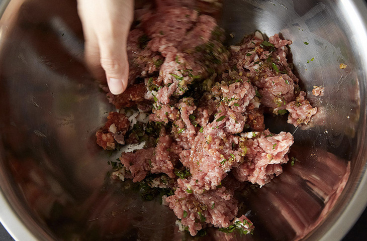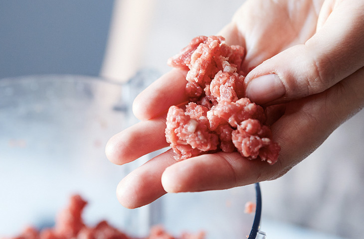 На выходе у вас должна получиться не бесформенная масса с гладкой текстурой, а фарш, в котором четко виден помол и то, из чего он сделан. Этим же визуальным тестом можно воспользоваться, чтобы при покупке отличить качественный фарш от некачественного. В готовый фарш добавляются специи и другие ингредиенты, если они используются, после чего его вымешивают руками. В процессе вымешивания из фарша уйдет лишний воздух и он станет несколько плотнее. Самый простой способ проверить его готовность — обжарить небольшое количество на сковороде и попробовать. Обжарить нужно лишь слегка, без румяной корочки, поскольку она создаст дополнительный вкусовой фон, за ширмой которого будет сложно распознать основной вкус. Если текстура и вкусовые качества фарша вас устраивают, можно переходить к следующему этапу.