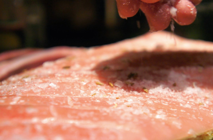 Теперь свиную грудинку необходимо пропитать сухим маринадом — он придаст мясу насыщенный вкус и аромат. Чем натереть мясо, во многом зависит от ваших вкусов. Например, аромат свиной грудинки гармонично оттеняет смесь меда, лимонного сока, соли и традиционной китайской смеси «пять специй», в состав которой входит гвоздика, бадьян, корица, сычуаньский перец и семена фенхеля. Натирается смесью только мясо свиной грудки, на кожу специи не наносят.