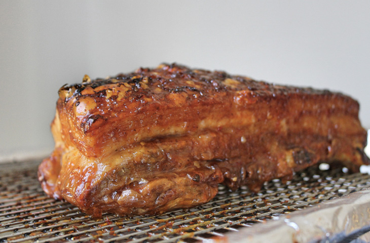 Покрытую маринадом свиную грудинку выложите на решетку, установленную на противне, и отправьте в разогретую до 180 °C духовку. Запекайте от 30 минут до 1 часа, после чего увеличьте температуру до максимума и готовьте еще 15-25 минут до появления невероятно хрустящей румяной корочки, об образовании который вы узнаете по доносящемуся из духовки аромату.