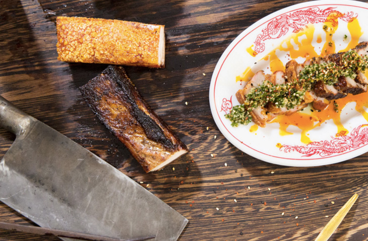 Готовую свиную грудинку нарежьте поперек небольшими ломтиками. Выложите их на тарелку и приправьте соусом, сделанным из мелко рубленого имбиря, масла виноградных косточек, кунжутных семечек, измельченного зубчика чеснока, лука-порея, зеленого лука, белого перца, соли и сахара или соусом на основе масла чили, кумина и аниса.