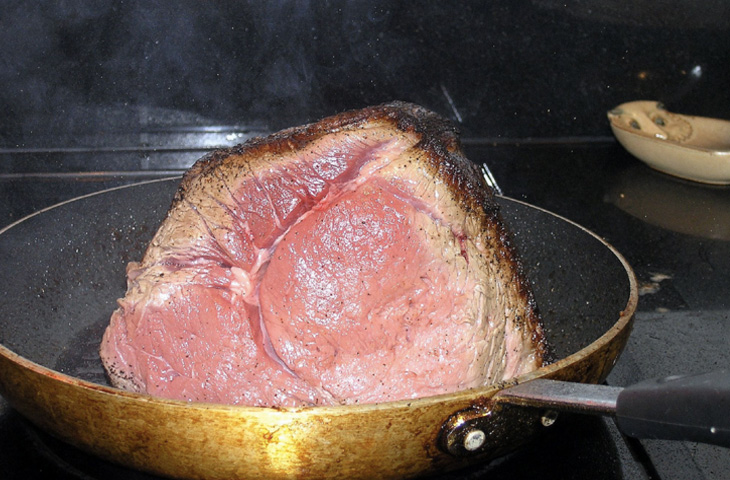 Если этого позволяют размеры посуды, перед тем как поставить мясо в духовку, его можно обжарить на хорошо раскаленной сковороде. Такая быстрая термическая обработка при высокой температуре обеспечит кусок аппетитной золотисто-коричневой корочкой. После в духовке, его уже можно будет готовить при более низких температурах, что позволит довести мясо именно до желаемой степени прожарки. Кроме того, при такой технике розовая зона в центре будет больше, нежели при приготовлении только в духовке, а серая окантовка по краю внутри мяса получится тоньше.